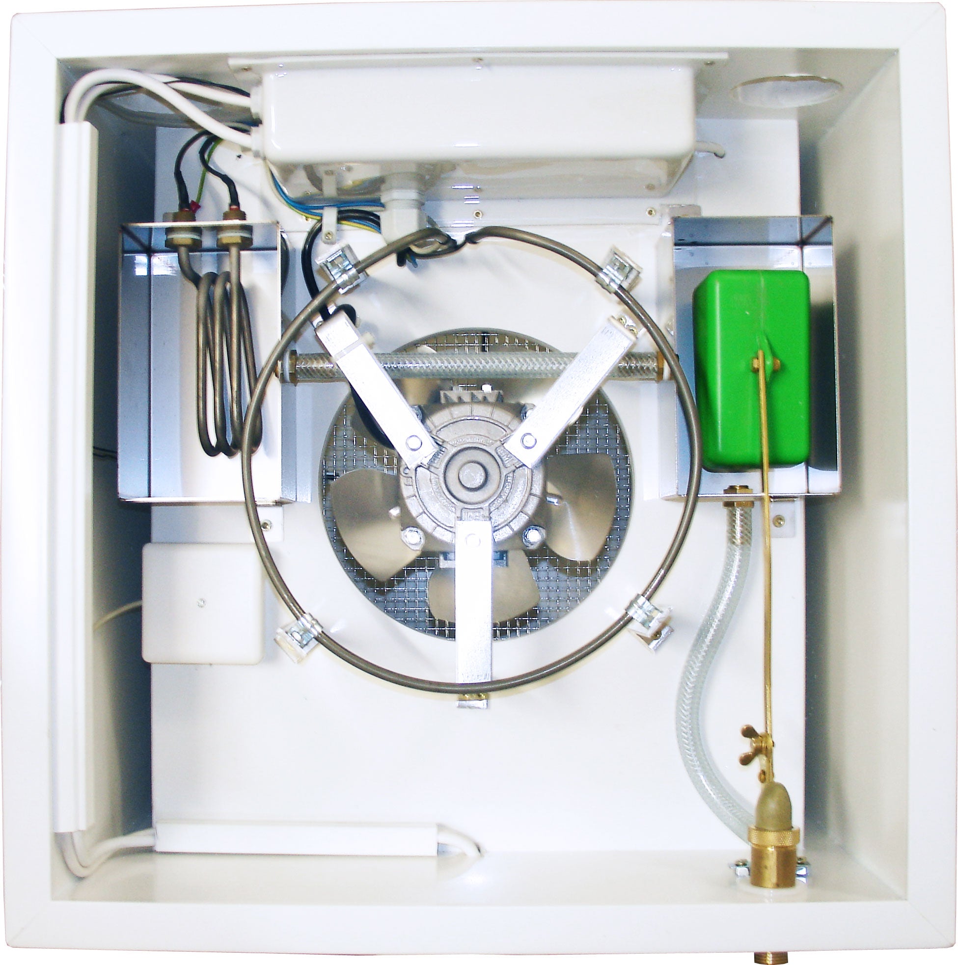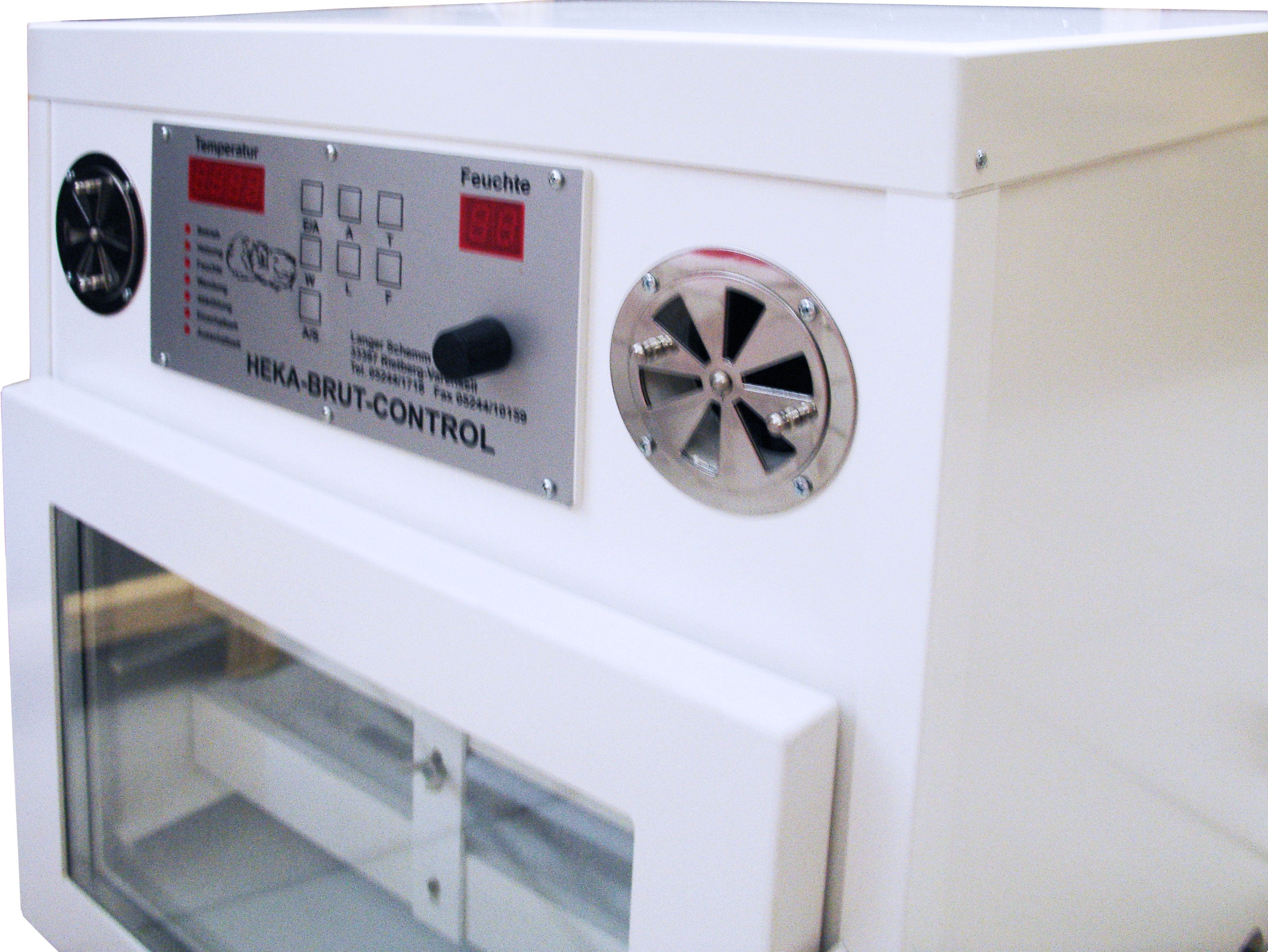 double-walled cabin as well as with premium-quality, powerful fans (adjusted in size for each model), which press the air from the technical compartment down and which then let the air flow through the side canal upwards again. This results in a maximum of temperature constancy on different layers of the incubator as well as on different sides of the incubator. There is no need for reallocating the eggs because of different temperatures inside the incubator with high-quality HEKA-incubators.