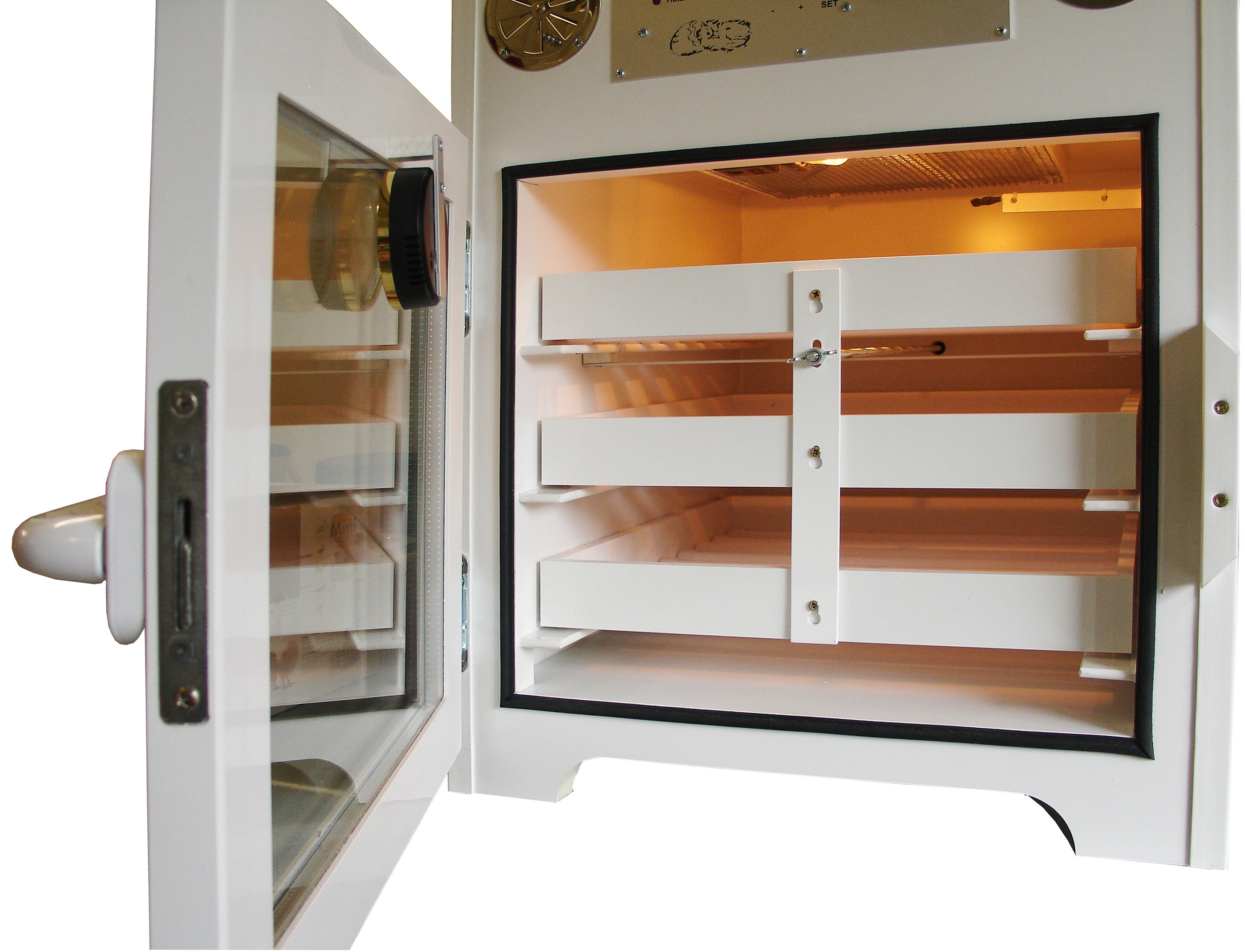 Alle Brutmaschinen der Serie "HEKA-Favorit" sind serienmäßig mit isolierverglaster Scheibe ausgestattet. Der Isolierwert ist gegenüber einer Einfachverglasung entschieden besser, wodurch der Energieverbrauch spürbar sinkt. Gleichzeitig beschlägt eine isolierverglaste Tür erst ab knapp 80% rel. Luftfeuchtigkeit - also erst jenseits der Werte, die in aller Regel benötigt werden.