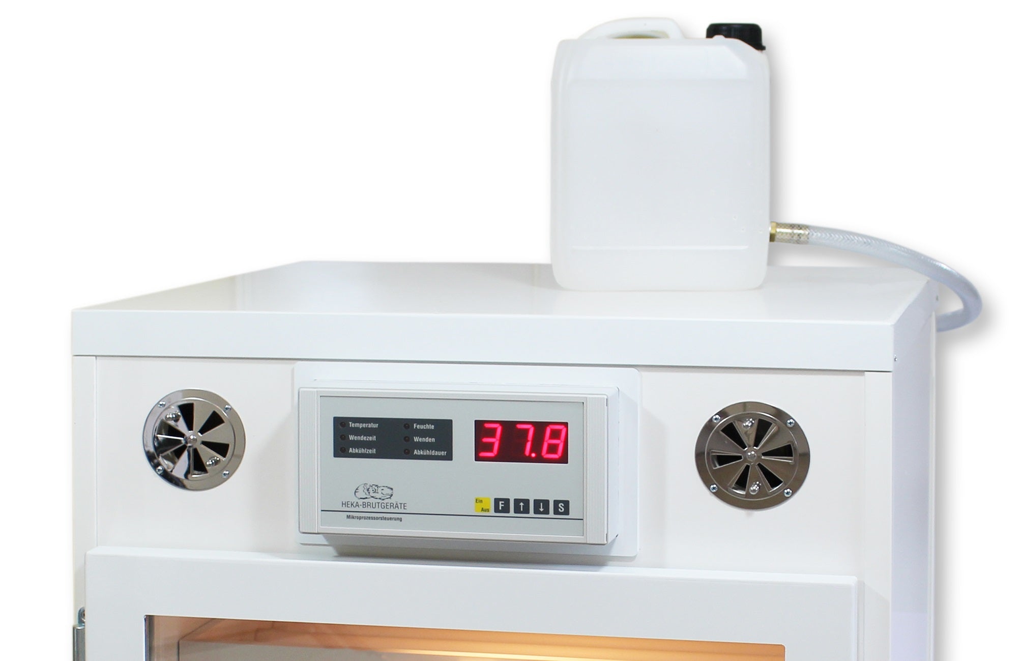 Alle HEKA-Brutgeräte mit Befeuchtung verfügen über eine absolut vollautomatische Befeuchtung. Standardmäßig wird ein Wasserkanister mitgeliefert und angeschlossen, der als Wasserreservoir für die Befeuchtung dient. Möglich ist aber auch der Anschluss direkt an die Wasserleitung. Gerne stellen wir Ihr Gerät direkt für den dann herrschenden höheren Wasserdruck ein - eine kurze Nachricht reicht dazu. Ein speziell für unsere Brutgeräte entwickeltes Niederdruck-Schwimmerventil regelt absolut zuverlässig die Wasserzufuhr aus dem Kanister oder aus der Wasserleitung. Beim Auf- und Nachheizen des Geräts wird dann eine Wasserheizung angesteuert, die das Wasser erwärmt und verdampfen lässt. Eine störungsfreie und zuverlässige Technik für optimalen Bruterfolg.
